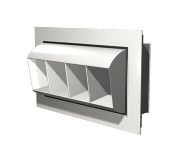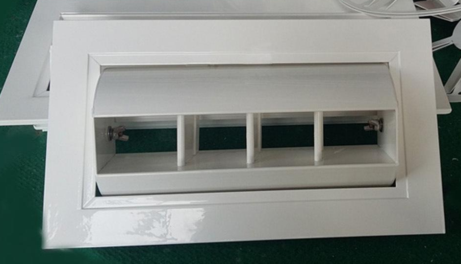 鼓形風(fēng)口具有送風(fēng)角度雙向調(diào)節(jié)的特點(diǎn),用作空調(diào)系統(tǒng)和通風(fēng)系統(tǒng)的送風(fēng)出口。風(fēng)口為矩形外框結(jié)構(gòu),外框內(nèi)套有鼓殼,鼓殼內(nèi)設(shè)有聯(lián)動流線型活動葉片。鼓殼可以在俯仰方向上沿水平軸在正負(fù)300度的角度范圍內(nèi)調(diào)節(jié)。連桿葉片可以在正負(fù)450度的角度范圍內(nèi)沿水平方向調(diào)節(jié)。改變空氣供應(yīng)的方向。風(fēng)量可以用風(fēng)量調(diào)節(jié)閥調(diào)節(jié)。